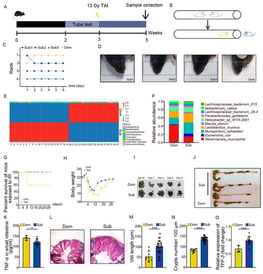 The tube test is a robust and reliable behavioral assay to investigate social hierarchy in mice []. Four mice were co-housed for 2 weeks then were tested pair-wise (Figure 1A,B). Based on the tube test, mice were categorized as one dominant (Dom) mouse and three subordinate (Sub) mice in a cohort (Figure 1C, Figure S1A,B). The results of the tube test were validated by barber assay (Figure 1D). We performed 16S rRNA sequencing to assess the gut microbiota, and observed that mice of different social hierarchical status harbored specific intestinal bacteria configurations (Figure 1E,F, Supplementary Table S2), which was in line with the previous study []. Then, the Dom and Sub mice were exposed to total abdominal irradiation (TAI) to mimic radiotherapy for pelvic and abdominal cancers. Intriguingly, Dom mice showed a lower survival rate following 18 Gy of TAI (Figure 1G). Dom mice also experienced overt intestinal radiation toxicity, as judged by lower body weight (Figure 1H) and food intake (Figure S1C), fewer formed fecal pellets (Figure 1I, Figure S1D), shorter colons (Figure 1J, Figure S1E), and higher levels of inflammatory factors (Figure 1K, Figure S1F–J). H&E staining showed that the intestinal villi were scarcer and shorter, and the crypts were less frequent in Dom mice than in Sub ones (Figure 1L–N). In parallel, qRT-PCR assay further revealed lower expression levels of intestinal integrity-related genes in the small intestines of Dom mice (Figure 1O, Figure S1K,L). All the evidence indicates that mice of higher status were more predisposed to serious intestinal radiation injuries compared with the ones of low ranking.