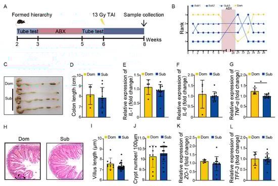 ABX treatment eliminated the difference in intestinal radiation injury between Dom and Sub mice. (A) Experimental protocol. (B) The ranked positions of one cage of mice tested daily before and after ABX treatment. (C) Photographs of dissected colons from mice in the two groups. (D) Statistical results of colon length between the two groups. (E–G) The mRNA levels of IL−1, IL−6, and TNF−α in small intestinal tissues of mice were examined by qRT−PCR. (H) The morphology of small intestine was revealed by H&E staining. (I) Length of small intestinal villi in Dom and Sub mice. (J) Numbers of small intestinal crypts in Dom and Sub mice. (K,L) The mRNA expression levels of ZO−1 and TFF−3 in small intestinal tissues of mice were examined by qRT−PCR. Statistically significant differences are indicated: Student’s t test, n = 4 in Dom group, n = 12 in Sub group, * p < 0.05.