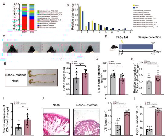 Next, we aimed to screen for the gut microbe which was able to mitigate intestinal radiation injury in high-ranking mice. For the monoassociation study, Lactobacillus murinus (L. murinus) was selected due to (i) its recognition as a classic probiotic [,], (ii) its presence as the dominant gut strain in both Dom and Sub mice (Figure 1F and Figure 5A,B), (iii) its significant reduction in frequency in Dom mice after TAI (Figure S5A). We clarified the radioprotective function of L. murinus in mice without social hierarchy, which have been most frequently used in traditional research (Figure 5C). We treated the experimental mice with L. murinus orally once a day for 2 weeks before TAI (Figure 5D). As expected, mice receiving total abdominal irradiation that were gavaged with L. murinus had longer colons than the controls (Figure 5E,F). In addition, treatment with L. murinus alleviated inflammatory status (Figure 5G, Figure S5B–E) and up-regulated integrity-related genes (Figure 5H,I, Figure S5F) in small intestinal tissues. H&E staining further showed that L. murinus repaired the structure of the small intestine, as judged by taller and denser villi as well as more crypts retained (Figure 5J–L). Together, our observations indicate that L. murinus was able to alleviate intestinal radiation toxicity in mice without social hierarchy.