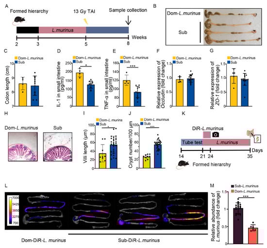 Radioprotection from L. murinus is not obvious for Dom mice. (A) Experimental protocol. (B) Photographs of dissected colons. (C) Statistical comparison of colon lengths between the two groups. (D,E) The protein levels of IL−1 and TNF−α in the small intestine were measured by ELISA. (F,G) The mRNA expression levels of occludin and ZO−1 in small intestinal tissues from Dom mice treated with L. murinus and Sub mice were examined by qRT−PCR. (H) The morphology of the small intestine was revealed by H&E staining. (I) Length of villi in small intestinal tissues. (J) Numbers of crypts in small intestinal tissues. (K) Experimental protocol. (L) In vivo fluorescence imaging performed on Dom and Sub mice after DiR−labeled L. murinus administration. (M) Relative abundance in small intestines of Dom and Sub mice after L. murinus administration, according to q−PCR. Statistically significant differences are indicated: Student’s t test, n = 4 in Dom group, n = 12 in Sub group, * p < 0.05 and *** p < 0.001.