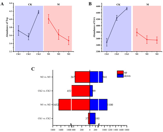 Certain differences between the changes in tryptophan and IAA contents in the leaves at different growth stages were observed. The Trp content initially decreased and then increased from CK1 to CK3, whereas it decreased consistently from M1 to M3 (Figure 1A). The IAA content showed an upward trend from CK1 to CK3, which was the opposite of the change observed from M1 to M3 (Figure 1B). The trend for the Trp content in the CK1–CK2 stages was opposite to that of IAA content, whereas the trend for the Trp content in the CK2–CK3 stages was identical to that of IAA content. In contrast, the changes in Trp content from M1 to M3 were identical to the changes in IAA content.
