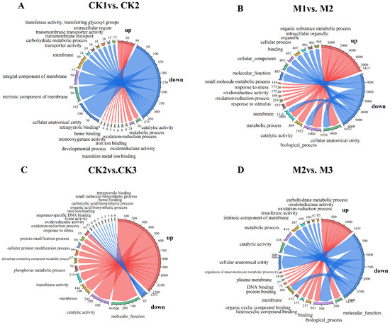 Circos plot of gene ontology (GO) enrichment of differentially expressed genes (DEGs). The right half-circle indicates the number of up- and down-regulated DEGs in each comparison group; red indicates up-regulation and blue indicates down-regulation. The outermost circle of the left half-circle indicates the GO terms and different colors represent different GO terms; the inner circle indicates the number of up- and down-regulated DEGs for each GO term. Arrows point from up- and down-regulated genes to GO terms, and arrow thickness indicates the abundance of up- and down-regulated genes for each GO term. (A) CK1 vs. CK2, (B) M1 vs. M2, (C) CK2 vs. CK3, and (D) M2 vs. M3.