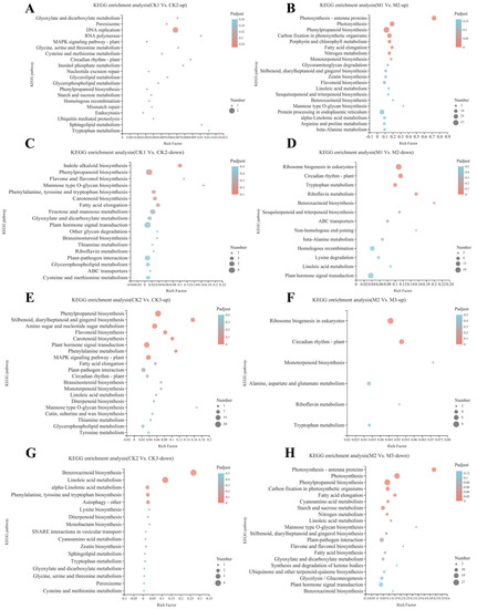 Bubble diagram of KEGG pathway enrichment of differentially expressed genes. The Y−axis shows the name of the pathway and the X−axis represents the Rich factor. The larger the Rich factor, the greater the degree of enrichment. (A) M1 vs. M2−up, (B) CK1 vs. CK2−up, (C) M2 vs. M3−up, (D) CK2 vs. CK3−up, (E) M1 vs. M2−down, (F) CK1 vs. CK2−down, (G) M2 vs. M3−down, and (H) CK2 vs. CK3−down.