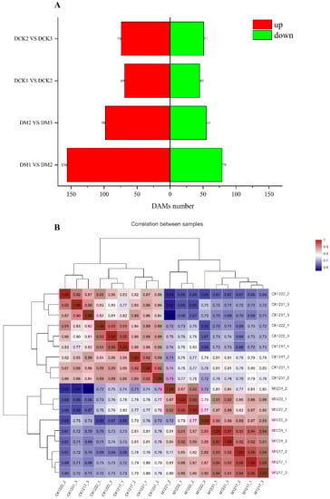 Metabolomic analysis of maize of different growth stages. (A) Distribution of up- and down-regulated DAMs. red is up, green is down. (B) Cluster heatmaps of the three biological replicates, red indicates a strong correlation, blue indicates a weak correlation.