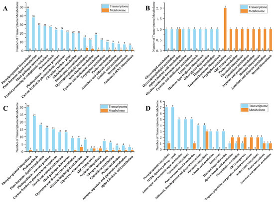 Mapping of differentially expressed genes (DEGs) and differentially accumulated metabolites (DAMs) to KEGG pathways. The Y-axis represents the number of transcriptomics (DEGs)and metabonomics(DAMs), and the X-axis represents the pathway. Blue is Transcriptom, orange is Medabolome. (A) CK1 vs. CK2, (B) M1 vs. M2, (C) CK2 vs. CK3, and (D) M2 vs. M3.