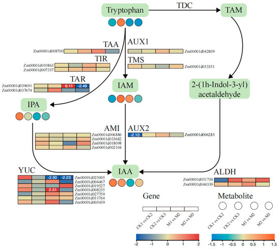 In addition, the expression of key metabolites was analyzed. A total of 12 metabolites were identified in the auxin biosynthesis pathway and the Trp synthesis pathway (Figure 6 and Figure S6), comprising chorismate, anthranilate, 5-phosphoribosylanthranilate, 1-(O-carboxyphenylamino)-deoxyribulose-5-phosphate, indole-3-glycerol phosphate, indole, Trp, IPA, IAM, TAM, 2-(1H-indol-3-yl)acetaldehyde, and IAA. Similarly, the expression levels of the metabolites also changed. In general, the IPA pathway contained more DEGs, including Zm00001d039691, Zm00001d037674, Zm00001d025005, Zm00001d004467, Zm00001d019527, Zm00001d008255, and Zm00001d005439.