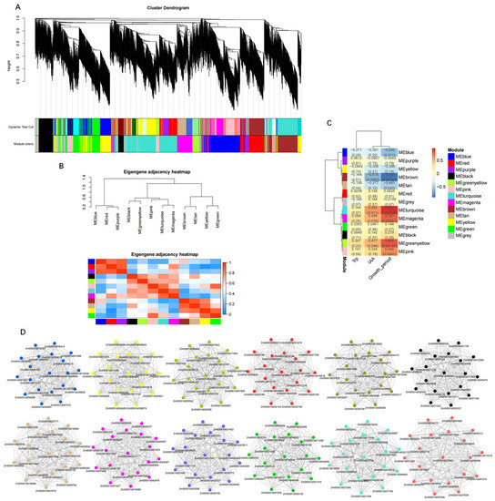 Weighted gene coexpression network for maize. (A) Cluster analysis dendrogram of differentially expressed genes (DEGs), with dissimilarity based on the topological overlap, together with assigned module colors. The clustered branches represent different modules, and each line represents one DEG. (B) Heatmap of connectivity of eigengenes. (C) Module–trait associations. Each row corresponds to a module characteristic gene (eigengene) and each column corresponds to a trait. Each cell contains a corresponding correlation coefficient and p-value. (D) Visualization of network relationships of hub genes in 12 modules.