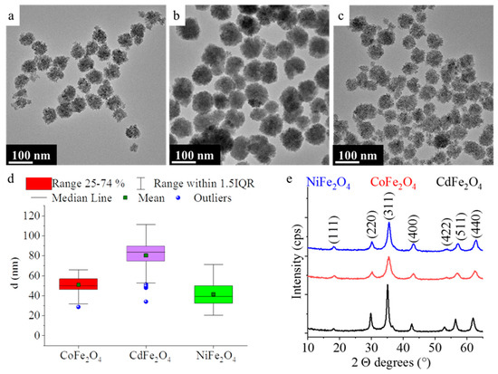 HRTEM pictures of the CoFe2O4-NH2 (a), CdFe2O4-NH2 (b) and NiFe2O4-NH2 (c). Box plot diagrams for the particle size analysis (d) and the XRD pattern of the ferrites (e).