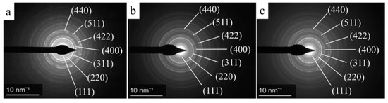 Electron diffraction patterns of the CoFe2O4-NH2 (a), CdFe2O4-NH2 (b) and NiFe2O4-NH2 (c) with the Miller indexes (PDF 89-2810; PDF 22-1086 and PDF 10-0325).