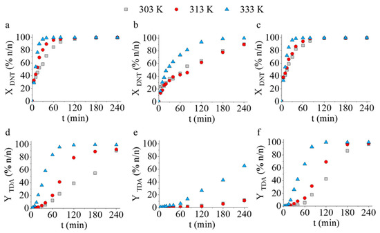 DNT conversions and TDA yields vs. time of hydrogenation at 303 K, 313 K, and 333 K using Pd/CoFe2O4-NH2 (a,d), Pd/CdFe2O4-NH2 (b,e), and Pd/NiFe2O4-NH2 (c,f) catalysts.