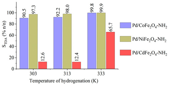 The maximum selectivity of TDA at three reaction temperature for the magnetic catalysts.