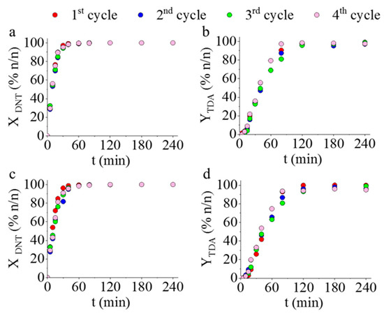 Reuse tests of the Pd/CoFe2O4-NH2 (a,b) and Pd/NiFe2O4-NH2 (c,d) catalysts. Change of the 2,4-DNT conversion and 2,4-TDA yield vs. time of hydrogenation.