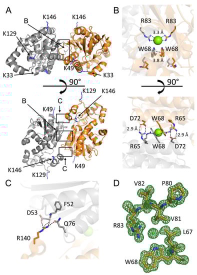 The biological assembly of PGAM2, as predicted by PISA assembly [18] and based on homology with PGAM1 structures (PDB codes: 1YFK, 4GPI, 4GPZ, [2,4]), is a homodimer, with the second subunit generated by the crystallographic twofold axis. The two PGAM2 subunits interact via a pair of salt bridges between the side chains of residues R65 and D72, an ionic interaction of residues R83 interestingly mediated by a chloride ion, and by π–π stacking of the indole rings of residues W68. These interactions are located in a central hydrophobic region formed by antiparallel α-helices 60–74, loops 75–80 and short antiparallel β-strands 81–83 (Figure 1B). At the edge of the dimer interface, two additional sets of interactions are formed by the R140 residues of one subunit and F52, D53, and Q76 of the complementary subunit (Figure 1C). The fact that identical interactions are found at the interface of PGAM1 homodimers [2,4] provides a convincing and elegant explanation for the existence of PGAM1–PGAM2 heterodimers.