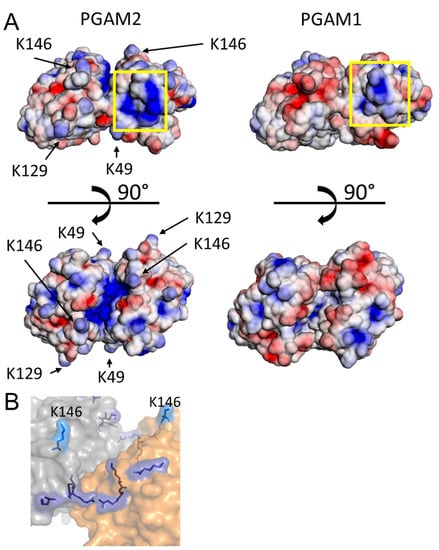 Lysine residues potentially engaged in nuclear import of PGAM2. (A) Solvent accessible surface potential of PGAM1 (PDB ID 4GPI) and PGAM2, colored from −3 kT/e (red) to 3 kT/e (blue). Calculated by APBS [20]. Yellow box—positive surface patch common to both PGAM1 and PGAM2. (B) Proposed NLS of PGAM2: orange, gray—subunits of the PGAM2 homodimer, light blue—K146 residue necessary for proper nuclear import, present in PGAM2 but not PGAM1, dark blue—positively charged residues in the vicinity of K146, conserved in both PGAM1 and PGAM2 (K138, R140, R141, K176, K179, R180).