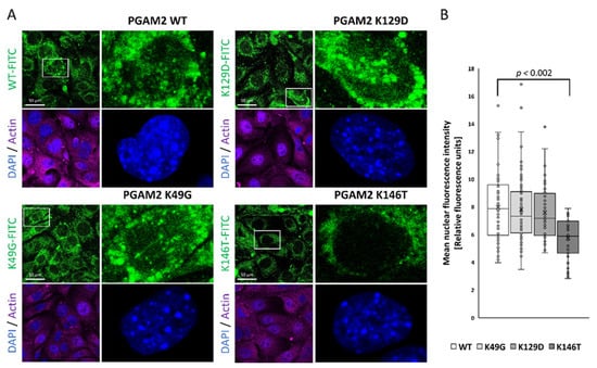 We designed and purified a series of recombinant human PGAM2 forms, each carrying one of the following mutations: K49G, K129D and K146T. The substitutions introduced into the PGAM2 sequence were the residues present at equivalent positions of human PGAM1 (Figure 4). We then analyzed the nuclear import of PGAM2 by transfecting KLN-205 cancer cells with fluorescently labeled PGAM2 mutants (Figure 4). No change in nuclear fluorescence was observed for the K49G and K129D variants. Mutation K146T, however, decreased the nuclear fluorescence intensity by about 30% (Figure 4). Specifically, the mean nuclear fluorescence intensity (arbitrary units) was 7.98 ± 2.61 in WT-transfected cells, 7.80 ± 2.33 in K49G-transfected cells, 7.58 ± 2.02 in K129D-trasnfected cells, and 5.73 ± 1.45 in K146T-transfected cells (F = 10.42, p = 0.000002, one-way ANOVA). We thus conclude that K146 is a part of the PGAM2 NLS, although likely not the only one, as nuclear localization was not completely abolished by K146 mutation.