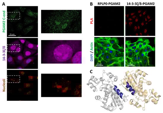 In vivo detection of PGAM2 interaction with RPLP0 and 14-3-3ζ/δ. (A) PGAM2 co-localizes with 14-3-3ζ/δ in the nucleoli, as determined using propidium iodide counterstaining. (B) Proximity ligation assay (PLA) did not show the presence of RPLP0–PGMA2 interaction within the cells. On the other hand, 14-3-3ζ/δ–PGAM2 complexes were observed, mainly in the cellular nuclei. (C) Hypothetical 14-3-3–binding site on the surface of PGAM2 dimer (gray and orange, PGAM2 subunits; blue, PGAM2 sequence: 60LKRAIRTLWAI70 which may recognize 14-3-3 proteins.