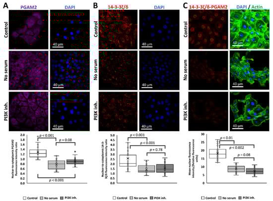 To obtain a deeper insight into the mechanism regulating the 14-3-3ζ/δ–PGAM2 complex formation, we cultured KLN-205 cells in conditions that were previously described to block the nuclear localization of PGAM2 [15]. Culturing the cells for 2 h in serum-depleted medium or in the presence of 1 μM wortmannin (an inhibitor of PI3K), showed a decreased amount of PGAM2 localized in the nuclei (Figure 6A). Specifically, the mean nuclear-to-cytoplasmic fluorescence intensity ratio of about 1.28 ± 0.3 was recorded in control conditions, 0.77 ± 0.19 in cells cultured in serum-free medium, and 0.9 ± 0.14 in presence of wortmannin (F = 42.65, p = 1 × 10−13, one-way ANOVA). The result was accompanied by both a lowered 14-3-3ζ/δ nuclear-to-cytoplasmic fluorescence intensity ratio (2.58 ± 1.53 in control conditions, 1.41 ± 0.47 in cells cultured in serum-free medium, and 1.57 ± 0.53 in presence of wortmannin, F = 12.73, p = 0.00001, one-way ANOVA) (Figure 6B) and 14-3-3ζ/δ–PGAM2 interaction (mean fluorescence intensity in the nuclear regions of about 18.28 ± 3.64 in control condition, 8.69 ± 2.25 in cells cultured in serum-free medium, and 7.19 ± 1.92 in presence of wortmannin, F = 147.55, p = 1 × 10−16, one-way ANOVA) (Figure 6C). The 14-3-3ζ/δ–PGAM2 interaction is strongly correlated with the nuclear localization of PGAM2, since inactivation or inhibition of the insulin/IGF1-PI3K signaling pathway abolished the binding of these proteins (Figure 6C).