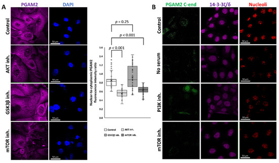 We show that the nuclear-to-cytoplasmic ratio of the fluorescence signal related to PGAM2 was unaffected when the cells were incubated for 2 h with the GSK3β inhibitor (SB216763), whereas the signal was significantly reduced in cells cultured with either the AKT or mTOR inhibitors (AKT Inhibitor IV and rapamycin, respectively) (Figure 7A). Specifically, the mean nuclear-to-cytoplasmic fluorescence intensity ratio was 0.85 ± 0.17 in the control experiment, 0.56 ± 0.1 in AKT inhibitor-treated cells, 0.92 ± 0.26 in GSK3β inhibitor-treated cells, and 0.63 ± 0.09 in mTOR inhibitor-treated cells (F = 31.96, p = 6 × 10−16, one-way ANOVA). This indicates that the nuclear localization of PGAM2 is regulated by the PI3K–AKT–mTOR but not PI3K–AKT–GSK3β pathway. The PI3K–AKT–mTOR pathway integrates signals from growth factors, nutrients and energy supply, and its activity promotes cell growth, metabolism, proliferation, and survival [46]. On the other hand, the inhibition of the pathway signaling, e.g., in hypoxic conditions, leads to autophagy [47]. Previously, the nuclear localization of PGAM2 has been linked with the maintenance of nucleolar structure, RNA synthesis, and assembly of new pre-ribosomal subunits [15]. Verification of whether the nuclear withdrawal of PGAM2 that is affected by inhibition of the IGF1–PI3K–AKT–mTOR pathway indeed resulted in the absence of PGAM2 in the nucleoli, we immunodetected PGAM2 C-end in propidium iodide counterstained cells. We found that in cells cultured in serum-free medium, and in the presence of PI3K or mTOR inhibitor, the nucleolar retention of PGAM2 was completely abolished (Figure 7B). However, 14-3-3ζ/δ is still present in the nucleoli under these conditions, which indicates that the 14-3-3ζ/δ–PGAM2 interaction is a prerequisite for PGAM2 nuclear import, but not export.