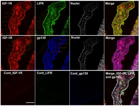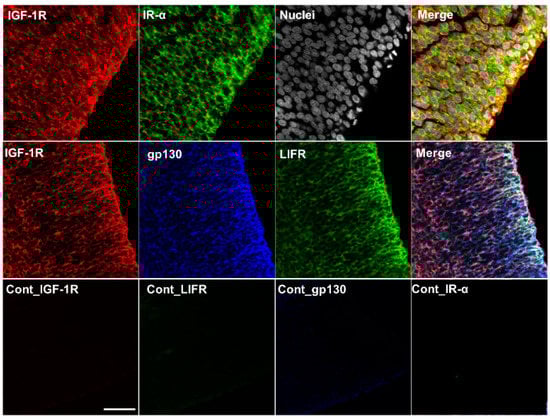 2.5. Colocalization of IGF-1R, IR-α, LIF Receptor (LIFR), and gp130 in the Cerebrum and Choroid Plexus of Rat Fetuses