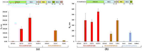 We found that all nucleic acids induced the assembly of FUS into high-order structures or protein-rich microphases that were detected within a certain range of the nucleic acid concentrations (Figure 2b). Upon the addition of a nucleic acid, FUS high-order assemblies arose at different FUS:nucleotide molar ratios in the range of 227:1 to 2.2:1.0 for PAR ([FUS]:[ADP-ribose]), 12.5:1.0 to 1.25:1.00 for RNA ([FUS]:[rNMP]), 8.6:1.0 to 0.86:1.00 for ssDNA ([FUS]:[dNMP]), and 4.2:1.0 to 0.42:1.00 for dsDNA ([FUS]:[dNMP]) (Figure 2a). In the case of PAR, particles with an Rh of 119 to 225 nm formed in a broad range of the [protein]:[ADPr] ratio (from~200:1 to~2.2:1.0), whereas in the cases of RNA, ssDNA, and dsDNA, large particles were found in a narrow range (12.5:1.0 to 0.42:1.00) of the [FUS]:[nucleotide] ratio (Figure 2b). On the one hand, our results showed similar patterns of FUS microphase separation induced by the presence of different nucleic acids. For example, if the [FUS]-to-[nucleotide] ratio was ≥1:1, then large particles (Rh ≈ 120–225 nm) formed, but nucleic acids readily disrupted assemblies when present in a large molar excess over FUS (Figure 2b). Under these conditions, large assemblies dissociated, and particles with smaller Rh (~31–3 nm) were detectable. Nevertheless, microphase separation started at a relatively high FUS-to-PAR ratio (~200:1), whereas the formation of large assemblies was observed at a lower FUS-to-rNMP(dNMP) ratio (~10:1) (Figure 2b). Thus, we were able to determine the optimal nucleic acid concentrations at which the formation of relatively stable FUS high-order structures or protein-rich microphases were detected. Consequently, the FUS-rich microphase separated state strongly depended on the FUS-to-nucleotide ratio, which was different for each type of nucleic acid polymer.