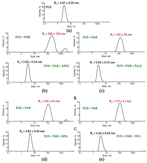 Subsequent addition of another protein (APE1, YB-1, RPA, PARP1, or Polβ) to the FUS–nucleic acid solutions resulted in the dissociation of the assemblies accompanied by a reduction in the particle size down to 3.3–8.4 nm, which matched oligomers of these proteins and/or their complexes with nucleic acids (Figure 4 and Figure 5).
