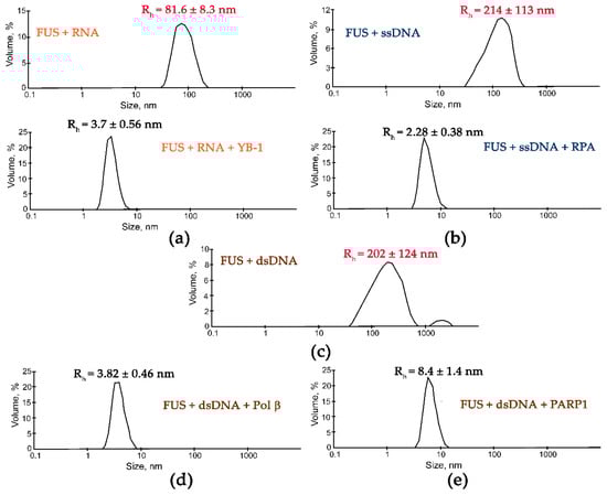 DNA repair proteins disrupt the FUS-RNA or FUS-DNA microphases. Typical volume-weighted size distributions for mixtures FUS–RNA (a), FUS–ssDNA (b), and FUS–dsDNA (c) before and after the addition of Yb-1 (a), RPA (b), Polβ (d), or PARP1 (e). The profiles were obtained by means of experimental autocorrelation functions in the Zetasizer Nano ZS software. The average hydrodynamic radii (Rh) computed from the distributions are presented as well. Rh is the average Rh value estimated from at least three DLS experiments. FUS–nucleic acid high-order structure assays in the presence of RNA-/ssDNA-/dsDNA-binding proteins were performed in reaction mixtures consisting of: (a) 10 μM FUS, 0.77 µM rNMP(RNA), and 2 µM YB-1; (b) 10 μM FUS, 5.5 µM dNMP(ssDNA), and 2.2 µM RPA; (с) 10 μM FUS and 7 µM dNMP(dsDNA); (d) 10 μM FUS, 7 µM dNMP(dsDNA), and 2.5 µM Polβ; (e) 10 μM FUS, 8.9 µM dNMP(dsDNA), and 2.5 µM PARP1. The Rh values were measured directly before and after 1 min incubation of FUS–nucleic mixture with proteins.
