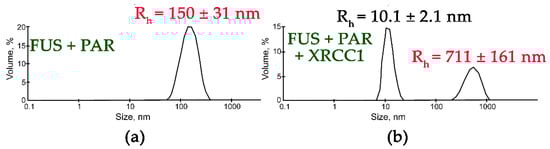 In contrast to the results obtained with YB-1, APE1, RPA, PARP1, or Pol β, an analysis of the influence of XRCC1 on FUS assemblies formed in the presence of PAR indicated that two types of particles with an Rh in the range of 10 to 711 nm were present (Figure 6). Although particles with a size corresponding to that of FUS–PAR assemblies (average Rh ~150 nm) disappeared, larger particles (average Rh ~711 nm) formed instead (Figure 6). These large particles may have represented higher-order FUS–XRCC1–PAR, FUS–PAR, and/or XRCC1–PAR assemblies.