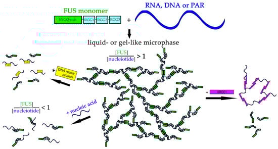 Although the assembly of FUS high-order structures and FUS LLPS in the presence of RNA, DNA, or PAR have been extensively characterized in vitro [,,,,,,], the influence of other proteins related to DNA-, RNA-, and PAR-dependent metabolic processes has not been investigated yet.