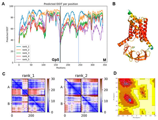 Confidence metrices for the predicted structure of Gp5/M of PRSSV-2 strain VR 2332: (A) Predicted local distance difference test (LDDT) score per position for the five models generated by alphafold2. The amino acid position is plotted against the predicted LDDT. Values between 70 and 90 indicate a high accuracy, where the prediction of the main chain of the protein is reliable. pLDDT values above 90 indicate very high accuracy, equivalent to structures determined by experiments. Values between 50 to 70 indicate a lower accuracy, but it is likely that the predictions of individual secondary structures are correct. (B) Cartoon model of the structure of Gp5/M showing the pLDDT per position, which is integrated as the b-factor in the PDB file delivered by alphafold2 in rainbow colors ranging from red (high confidence) to blue (low confidence). (C) Prediction aligned error (PAE) score for models ranked 1 and 2. This score displays the calculated error of the predicted distance for each pair of residues. Both axes indicate the position of the individual amino acids. The uncertainty in the predicted distance of two amino acids is color coded from blue (0 Å) to red (30 Å), as shown in the right bar. The color of the intersection of a horizontal line drawn from the position of an amino acid on the y-axis and a vertical line from the position of another amino acid on the x-axis indicates the error in the predicted distance between these two residues. PAE graphs are always characterized by a diagonal blue line, since amino acids that are juxtaposed in the primary sequence are also adjacent in the 3D structure. The upper left quadrant corresponds to errors in the distances of residues within Gp5, the lower right quadrant to errors within M, the upper right quadrant to errors between Gp5 and M, and the lower left quadrant to errors between M and Gp5. Note that model 1 has a lower error for the distances of the ectodomains, both within Gp5 and M and also between them. The errors for the transmembrane regions are very similar in both models. The error in the distances within and between the endodomains are also similar, but model 1 has a larger error in the distances between the endodomain and the transmembrane region. Note, however, that the differences between both models are rather marginal since both can be very well superimposed (Figure S1). (D) Ramachandran plot of the predicted structure of model 1. It shows the energetically allowed regions for backbone dihedral angles ψ against φ of amino acid residues in the Gp5/M structure. The φ-angle is the angle of the bond between the Cα-atom (which carries the amino acid side chain) to the N-atom, and the ψ-angle is the angle between the Cα-atom and the other C-atom of the peptide. For steric reasons, only certain combinations of ψ and φ angles are allowed. The red, brown, dark yellow and light yellow regions represent the favored, allowed, “generously allowed” and unallowed regions, respectively. Only one amino acid lies in the generously allowed region and none in the unallowed regions.