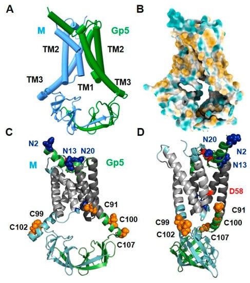 Figure 2 shows a simplified scheme (Figure 2A), a surface representation of hydrophilic and hydrophobic amino acids (Figure 2B) and two cartoons (Figure 2C,D, the latter rotated by 90°) of model 1 of the Gp5/M dimer. The known protein modifications are highlighted in the cartoon representations, with glycosylated asparagines highlighted as blue spheres and palmitoylated cysteines as orange spheres. Red sticks in the ectodomain indicate the disulfide bond between Gp5 and M. The negatively charged Asp58 in the TM2 of Gp5 is also shown as a red stick. See also the graphical abstract displaying the Gp5/M dimer embedded in a membrane, including the localization of the protein modifications. The assignment of the secondary structural elements to the amino acid sequence is depicted in Figure S2.