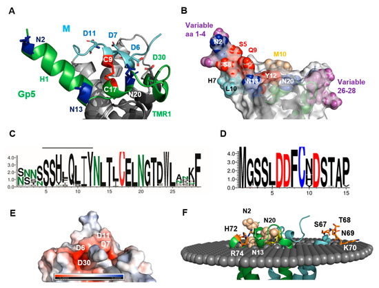 The remainder of the ectodomain of M was (almost) completely conserved, including Cys9, which formed the disulfide linkage with Gp5 (Figure 3D). The acceptor of the disulfide bond in Gp5, Cys 17, was also completely conserved, as was the central part of Gp5’s ectodomain sequence, including two N-glycosylation sites (Figure 3C). The ectodomain of Gp5 had two hypervariable regions (magenta spheres in Figure 3B). One comprised residues 26–28, which were located in the loop that connected the ectodomain to TM1. The region contained mostly hydrophilic amino acids with large side chains, such as Asn, Asp, Arg and Lys, which were exposed at one edge of the molecule’s surface. No function has been attributed to this region so far. The second hypervariable region encompassed residues 1 to 4 located at the beginning of the N-terminal helix. The region almost exclusively contained Asn and Ser and rarely Thr which, together with the highly conserved Ser at positions 5 and 6, could form a large variety of N-glycosylation motifs NXS/T. Thus, mutations occurring frequently in residues 1 to 4 during virus evolution can either remove or cause the attachment of an additional carbohydrate to Gp5. Some strains even contained the sequence NNSS, which corresponds to two overlapping glycosylation sequons. One or two carbohydrates attached to residues 1 to 4 at the beginning of the α-helix would probably prevent the access of antibodies to the neutralizing epitope (residues 5–12).