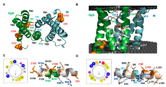 The structure of the transmembrane region of Gp5/M of PRRSV-2. (A,B) Top view and side view of the transmembrane region, the latter embedded in a virtual lipid bilayer. Palmitoylated Cys in Gp5 and M are shown as orange spheres. Conserved Pro in the middle of TM1 of both Gp5 and M are highlighted as wheat sticks in (B). Amino acids that form ionic interactions between Gp5 and M are highlighted as sticks. Asp58 forms an ionic bond with Lys35 in M, which is located in the loop between TM1 and TM2 and also interacts with Thr43 in TM1 of Gp5. In the outer membrane leaflet, the hydroxyl group of Tyr81 in TM3 of Gp5 interacts with the main chain in TM1 of M at position Thr25. The side chain of this Thr interacts with the main chain of the ectodomain of Gp5 at position Leu16. Finally, Glu34 in TM1 of Gp5 interacts with the main chain of M at position 75 located at the end of the loop connecting TM2 and 3. (C,D) Heliquest analysis of the C-terminal region of TM3 of Gp5 (C) and M (D) and structure of the corresponding domain. Heliquest produces a helical wheel from the sequence with an arrow inside that points to the hydrophobic face. Its length corresponds to the hydrophobic moment. A hydrophobicity <H> of 0.483 and a hydrophobic moment <µH> of 0.447 was calculated for Gp5, whereas the corresponding values for M are <H> 0.723 and <µH>: 0.335.