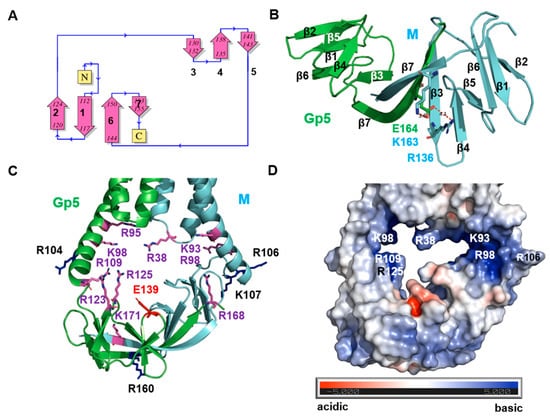 The structure of the endodomain of Gp5/M of PRRSV-2. (A) Topology sketch of the endodomain of M. β-strands 1, 2, 6 and parts of 7 build one β-sheet, and β-strands 3, 4 and 5 build another β-sheet. Note that the topology of the endodomain of Gp5 is the same. (B) Cartoon model of the endodomain, Gp5 in green and M in cyan. The numbering of the β-strands is indicated. Gp5 and M interact mainly via parts of β-strands 7 and via a salt bridge formed between the carboxyl group of Glu164 in β7 of Gp5 with the amine group of Arg163 located in β7 of M and with the guanidino group of Lys136 located in β3 of M. (C,D) Cartoon representation (C) and electrostatic surface potential of the surface (D) of the cytoplasmic part of TM1 to TM3 and of the endodomains of Gp5 and M. Basic amino acids are highlighted as magenta sticks They are located in loop 1 connecting TM1 and 2 of M (Arg38) in the amphiphilic helix (Arg95, Lys98) and in the endodomain of Gp5 (Arg123, Arg125). Lys93 and Arg98 in the amphiphilic helix of M and Arg168 in the endodomain of M form another strongly basic area on the other side of the cavity.