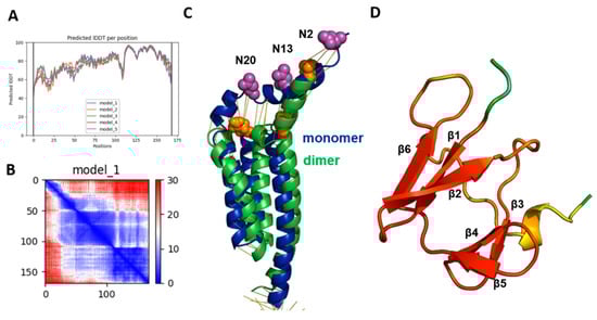 The membrane projection of Gp5/M showed that the two conserved glycosylation sites were very close to the membrane (Figure 3F and Figure S11). This is an unusual position since it might prevent the attachment of sugar chains by steric hindrance, i.e., the glycosylation sequon is not accessible by the membrane-bound oligosaccharyltransferase (OST) [68,69]. N-glycosylation occurs co-translationally, most likely on the monomer, and therefore we predicted the structures of the monomeric Gp5 and M of VR 2332 and compared them with the structure of the corresponding dimers. The calculated pLDDT scores of the monomeric Gp5 were only slightly lower compared with the Gp5/M dimer, between 60 and 80, even up to 90 in the TM3 of Gp5 (Figure 7A,B). An exception is the structure of the endodomain of the M protein, which exhibited pLDDT scores between 40 and 60 (Figure S15).