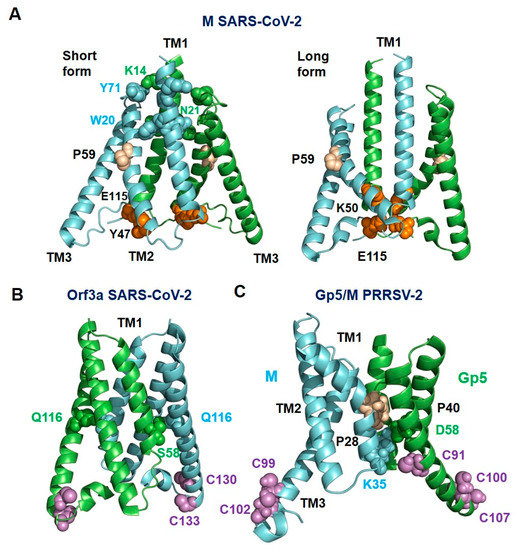 Structure of the transmembrane region of the short and long form of M (A), Orf3a (B) of SARS-CoV-2 and Gp5/M of PRRSV-2 (C). (A). One monomer of Orf3a and M of SARS-CoV-2 is colored green, and the other is colored cyan. Gp5 is colored green and M is colored cyan in the predicted structure of Gp5/M of the PRRSV-2 reference strain VR 2332. Proline residues in TM2 of M of SARS-CoV-2 and TM1 of Gp5/M are highlighted as wheat spheres, and cysteine residues at the C-terminus of TM3 of Gp5/M and Orf3a are highlighted as magenta spheres. Residues that form hydrophilic interactions between the monomers are highlighted as spheres with the color of the respective monomer. Residues forming interactions between the hinge region and TM2 in the short and long form of M of SARS-CoV-2 are highlighted as orange spheres. Figures were created with Pymol from PDB-file 7VGS (M, short form), 7VGR (M. long form) and 6XDC (Orf3a).