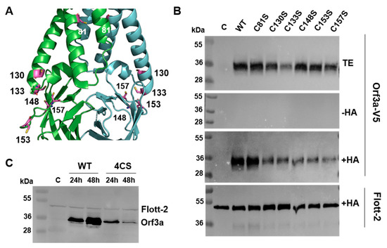 Another common feature of Gp5/M and Orf3a is a cluster of cysteine residues near the C-terminal part of TM3. Orf3a contained five cysteines in close proximity in the 3D structure: two were located at the end of TM3 (Cys130, Cys133) and three were in the adjacent cytoplasmic region (Cys148 in β1, and Cys153 and Cys157 are both located in the loop between β1 and β2 (Figure 10A)). Most of them were exposed at the surface of the molecule and hence could be subjected to fatty acid attachment. Except for Cys153, these residues were also present in the Orf3a of SARS-CoV. Conserved between SARS-CoV and SARS-CoV-2 was also Cys81 in the middle of TM2. To test whether one or more of these cysteines were acylated, they were individually replaced with serine, and the resulting constructs, fused to a C-terminal V5 tag, were expressed in 293T cells. Forty-eight hours after the transfection, cells were lysed and subjected to Acyl-RAC (resin-assisted capture), which exploits thiol-reactive resins to capture SH groups in proteins. A total of 10% of the total extract (TE) was removed from the lysate to determine the expression levels of Orf3a. Disulfide bonds in the proteins present in the remaining part were reduced, and newly exposed -SH groups were blocked. The sample was then equally split: one aliquot was treated with hydroxylamine to cleave thioester bonds, and the other aliquot was treated as a control with a Tris-HCl buffer. After the pull down of the proteins with the thiol-reactive resin, the samples were subjected to Western blotting using antibodies against the V5 tag. To exclude the proteins that were lost during sample preparation, we used antibodies against the cellular palmitoylated protein flotillin 2 as an internal control (Figure 10B). A strong signal was detected for Orf3a wt in hydroxylamine-treated (+HA) but not Tris-treated samples (-HA), indicating that the protein was acylated. The exchange of Cys81 had no effect on Orf3a expression (TE) and its palmitoylation level (+HA) compared with Orf3a wt. A replacement of the other cysteine residues reduced the palmitoylation of Orf3a but could not completely prevent it. Note, however, that the expression level of most Orf3a mutants is also lower, as has been previously observed for C133. The quantification of the bands revealed no reduction in the palmitoylation of the mutant C81S (96%), a moderate reduction in C133S (72%), a stronger reduction in C130S (51%) and C157S (53%), and the strongest reduction in mutants C148S (31%) and C153S (38%) relative to wt Orf3a (100%). We then created a mutant where four cysteines (130, 133, 148, 153) were exchanged simultaneously to analyze whether acylation was completely abolished. The signal for this mutant in the total cellular extract was much weaker, which prevented the determination of the palmitoylation level. The mutant Orf3a was apparently degraded since the amount was weaker at 48 h compared with 24 h after transfection, whereas the signals for Orf3a wt increased during this time period (Figure 10C). We conclude that Orf3a was acylated at several cysteines located at the end of TM3 and in the cytoplasmic tail, and that the cysteines worked synergistically with each other, i.e., acylation at one Cys increased the probability that a second residue was modified, as described previously for the Gp5/M of PRRSV and the S of SARS-CoV-2. Moreover, the removal of the acylation sites gradually destabilized Orf3a, causing its degradation.