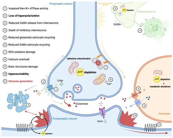 Neurons rely mostly on aerobic metabolism to maintain membrane polarization through the action of Na+ and Ca++ channels. Recent findings have shown that there is a significant association between epilepsy and metabolism within the brain [8]. Considering this, the ATP depletion resulting from defective OXPHOS mainly explains the occurrence of seizures in primary mitochondrial diseases (Figure 1). On one hand, impaired membrane channels and Na+/K+ ATPase activity results in the loss of neuron hyperpolarization. On the other hand, defective mitochondrial metabolism leads to excessive cell excitation through diverse mechanisms: (1) lowering of GABA-mediated inhibition resulted from death of inhibitory interneurons (especially in the occipital cortex); (2) suppression of hippocampal intermediate inhibitory neurons activity; (3) increasing of glutamate release in the synaptic space by astrocytes. Notably, interneurons appear to be more susceptible than primary neurons to the OXPHOS deficiencies, especially those resulting from complex I and complex IV defects [8,9,10]. This can explain why not all complexes’ defects provoke epilepsy with the same frequency and degree, and why some genetic defects are more prone to causing epilepsy (Table 1). An astrocyte–neuron metabolic interplay through the action of a lactate shuttle is supposed to primarily sustain the energetic requirement of neurons, especially during high synaptic activity [11].