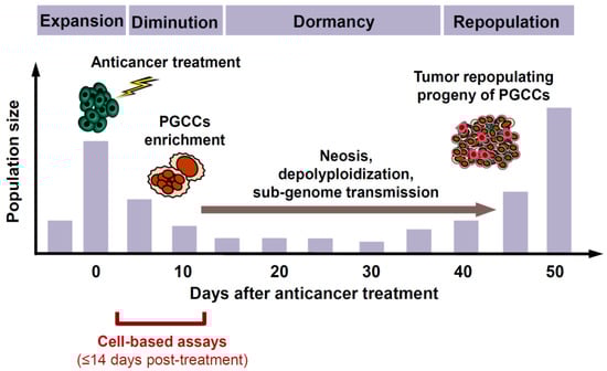 - Although PGCCs are often fully manifested within ~3 days after treatment with anticancer agents and their depolyploidization and nuclear budding processes can commence at any time thereafter, it can take several weeks or months until a stable, rapidly proliferating population of daughter cells emerges that repopulates the tumor [50]. Thus, as illustrated in Figure 1, the time required between therapeutic exposure and emergence of tumor repopulating progeny of cancer cells triggered to undergoing dormancy through polyploidy and/or multinucleation is much longer than the time span of multiwell plate cell “viability” (e.g., MTT, CellTiterGlo, etc.), colony formation, and other widely used preclinical anticancer assays for cell “killing”.
