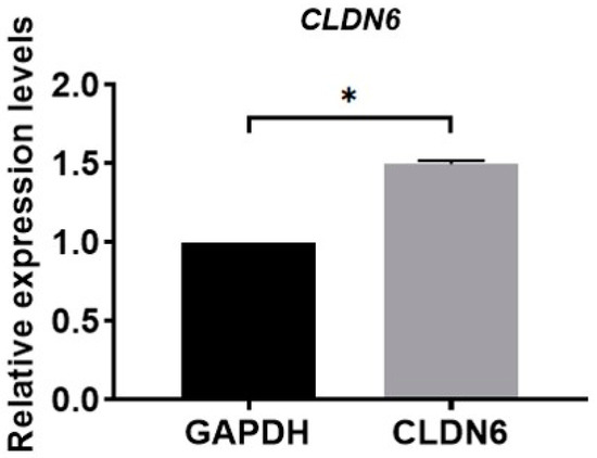 Relative mRNA level of CLDN6 gene in bovine CCs was analyzed using RT-qPCR. Results were normalized to the mRNA level of GAPDH. Data are shown as means ±SD from three independent experiments. * p < 0.05.