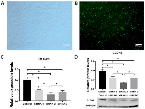 Effects of siRNA targeting CLDN6 gene on its expression at mRNA and protein levels in bovine CCs. (A) CCs before siRNA transfection; (B) CCs transfected with siRNA; (C) The mRNA levels of the CLDN6 gene in cells transfected with different siRNAs; (D) CLDN6 protein levels in cells transfected with different siRNAs. Control group was cells transfected with siNC. * p < 0.05. Bar = 100 μm.