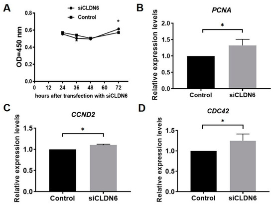 The proliferation of bovine CCs transfected with siCLDN6 or siNC sequence were detected at 24 h, 36 h, 48 h and 72 h after transfection with the CCK-8 kit. Results showed that the proliferation rates of CCs with or without CLDN6 knockdown showed the same trend, which decreased from 24 h to 48 h, then began to rise up to 72 h after siRNA transfection. Compared with the control group, CLDN6 knockdown significantly increased the CCs’ proliferation at 72 h after transfection (p < 0.05), whereas it had no influence at 24 h, 36 h and 48 h (p > 0.05, Figure 5A). Additionally, three proliferative genes, PCNA, CCND2 and CDC42, were significantly up-regulated in CCs with CLDN6 knockdown (p < 0.05, Figure 5B–D).