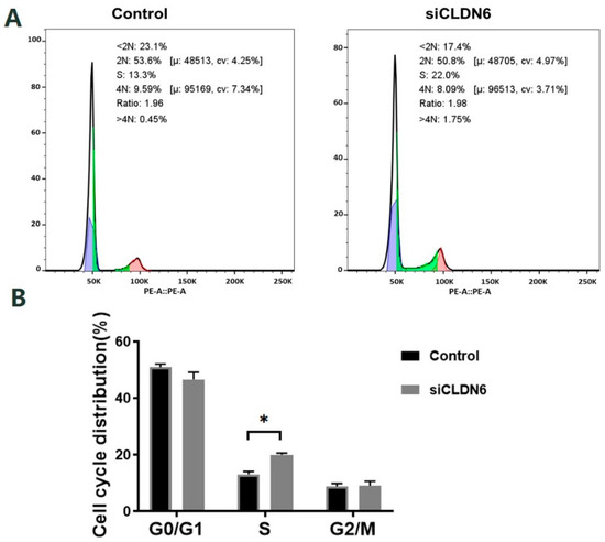 Bovine CCs transfected with siRNA or siNC sequence were stained with PI and the cell cycle was detected by flow cytometry (Figure 6A). According to Figure 6B, CLDN6 knockdown induced the significant accumulation of cells in the S phase. However, the cell proportion in the G0/G1 phase and G2/M phase showed no significant difference in CCs with or without CLDN6 knockdown (p > 0.05).