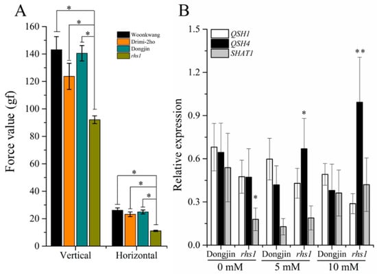 Analysis of rsh1 plants showed that the seeds of these plants needed 35% and 50% less vertical and horizontal force, respectively, to pluck the grain from inside the spikelet, compared to that required for the wild-type (WT) plants and those of the other two cultivars, Wonkwang and Drimi-2ho (Figure 1A). Nitric oxide has been widely recognized as a master regulator of a plethora of physiological processes in plants. However, the role of NO in regulating seed shattering is not yet known. In a previous study, in the transcriptomic analysis of rice induced by 1 mM CysNO, it was revealed that RHS1 was down-regulated (Supplementary File S1; Table S2). Accordingly, NO was applied exogenously to investigate any linkage among NO, RHS1, and shattering-related known genes. As a result, the expression of shattering-related genes, especially SHAT1, exhibited a significantly lower expression in the rhs1 plants compared to the WT plants under normal conditions. Apart from that, nitrosative stress negatively regulated the expression of QSH1 and SHAT1 in both the WT and rhs1 plants, but it positively regulated QSH4 expression in only the rhs1 plants (Figure 1B).