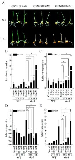 Furthermore, many studies have shown that plants with higher levels of S-nitrosothiols exhibit a stunted phenotype, perturbed pollination, loss of viability or lower germination frequency, sterility, smaller leaves, and various abnormal floral and seed phenotypes [26]. Similarly, the rsh1 plants exhibited a relatively stunted phenotype (Supplementary Figure S3) and produced fewer seeds per panicle (subfigrue C in Section 3.4); thus, we attempted to evaluate the sensitivity of rsh1 mutants to nitrosative stress. For this, the WT and rsh1 plants were treated with 10 and 50 mM CySNO. The rhs1 seedlings showed an overall poor growth and exhibited acute sensitivity to nitrosative stress. Their leaves turned yellow within 12 h of treatment and their leaf tips became dried, necrotic, and turned brown, eventually leading to the death of the plants within 24 h (Figure 2A). Additionally, nitrosative stress caused a reduction in biomass plants (Supplementary File S1; Table S2). On the other hand, the WT plants showed less symptoms of nitrosative stress. This indicates that the absence of the RHS1 function makes plants sensitive to nitrosative stress, either due to a higher accumulation of NO at the cellular level or its associated forms, or due to loss of NO-scavenging ability. Quantitative real-time PCR analysis of nitric-oxide-related genes showed that, in rhs1 plants, the expression levels of genes responsible for NO production (OsNIA1, OsNIA2, and OsNOA1) were lower compared to that of OsGSNOR under normal conditions (Figure 2B–E). However, after treatment with the nitric oxide donor, we found a gradual increase in the expression of OsNIA2, which was responsible for the maximum amount of nitrate reductase activity or NO production through the reductive pathway (Figure 3E). Although OsNIA1 (Figure 2B) and OsNOA1 (Figure 2C) showed slight variations in their expression following nitrosative stress, 10 mM CySNO proved to be a terminal dose for a significant increase in their expression at 48 h post-treatment. These results were further supported by the lower expression of OsGSNOR in the rhs1 mutants (Figure 2D).