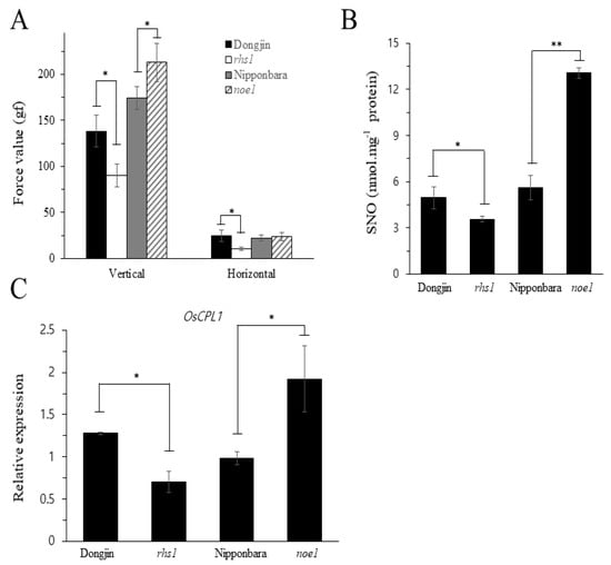 The higher relative expression of OsGSNOR, and the lower expression of NO production genes in the rhs1 plants, under normal conditions indicated a possible involvement of nitric oxide, or its derivatives, in seed shattering. Our results revealed a significantly higher force value for the noe1 (nitric oxide excess 1) mutant compared to the WT and rhs1, indicating that noe1 needs a higher force, both vertically and horizontally, to pluck the seeds from the spikelet (Figure 3A). Therefore, in order to investigate the possible role of endogenous SNO content and seed shattering, we measured the total SNO content of the rhs1, WT (Dongjin and Nipponbare), and the NO-overproducing mutant noe1 plants. The results showed significantly lower SNO levels in the rhs1 mutant lines, while noe1 exhibited significantly higher SNO contents compared to the wild-type and rhs1 (Figure 3B), indicating that the alteration of SNO content affects seed shattering. This result was further supported by the significantly lower expression of CPL1 (a negative regulator of seed shattering which represses the development of the abscission layer required for seed shattering) in rhs1 plants and the significantly higher expression in noe1 plants (Figure 3C). Altogether, our findings reveal that the loss of RHS1 function improves seed shattering in rice where endogenous SNO contents of rhs1 plants may play an important role, directly or indirectly.