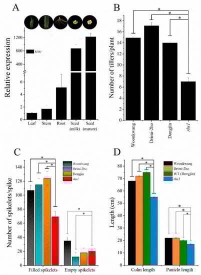 3.4. RHS1 Is Required for Normal Growth and Development in Rice