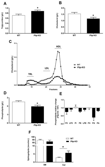 PLTP deficiency is associated with altered plasma lipid levels under a HF diet. Evaluation of plasma lipids levels in WT and Pltp-KO mice after 4 months of a HF diet. (A,B) Quantification of, respectively, the total plasma triglycerides and cholesterol. (C) Characterization of cholesterol in plasma lipoproteins (from pooled samples) by Fast protein liquid chromatography: triglyceride-rich lipoproteins (TRL), low-density lipoproteins (LDL) and high-density lipoproteins (HDL). (D) Quantification of total plasma phospholipid levels. (E) Ratios of phospholipid concentrations observed in Pltp-KO mice to the average of the calculated concentrations in WT mice: phosphatidylcholine (PC), lysophosphatidylcholine (LPC), phosphatidylinositol (PI), phosphatidylethanolamine (PE), lysophosphatidylethanolamine (LPE), phosphatidylserine (PS), phosphatidylglycerol (PG) and phosphatidic acid (PA). (F) Quantification of the total plasma sphingolipids: sphingomyelin (SM) and ceramides (Cer). Statistical analyses were performed using the matched Student’s t-test, * p < 0.05 (n = 10–12). All results are expressed as the mean ± SEM.