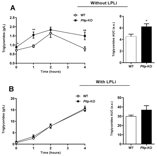 The oral lipid loading test led to a higher and extended TG peak in Pltp-KO mice compared with WT mice, with a higher TG AUC (6.23 ± 0.48 vs. 4.55 ± 0.38 a.u., respectively; p < 0.05) (Figure 4A). Importantly, when TG clearance was blocked with a lipoprotein lipase (LPL) inhibitor (LPLi), no differences in triglyceridemia were observed between the two genotypes (Figure 4B), indicating a key role of PLTP in TG removal from plasma.
