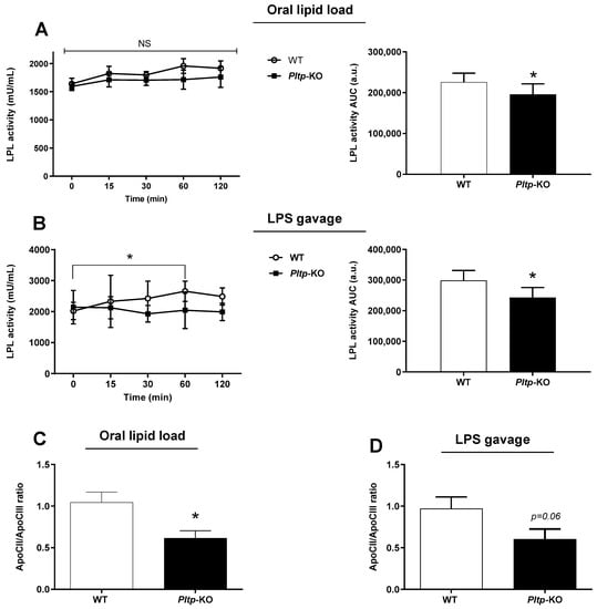 Plasma LPL activity was quantified after oral lipid or LPS loading (Figure 7). A 13% decrease in Pltp-KO mice compared to WT mice was observed after lipid gavage (p = 0.044), (Figure 7A) and a 18% decrease in Pltp-KO mice compared to WT mice was observed after the LPS oral load (p = 0.020) (Figure 7B). The plasma levels of apolipoprotein (apo) CII and apoCIII (LPL modulators) were determined in different conditions. The apoCII/apoCIII ratio was significantly decreased after an oral lipid load in Pltp-KO mice (0.61 ± 0.08 vs. 1.04 ± 0.12 in WT mice; p = 0.0122), and a similar trend was observed after the oral LPS challenge (0.60 ± 0.12 vs. 0.97 ± 0.14 in WT mice; p = 0.0619) (Figure 7C,D).