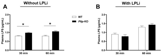 LPL inhibitor (LPLi) abrogates the modulatory effect of PLTP on the LPS plasma levels. Kinetics of the plasma LPS levels (µg/mL) in mice 30 and 60 min after LPS oral administration. (A) The plasma LPS levels after LPS gavage (n = 8). (B) The plasma LPS levels after LPLi (P407) i.p. injection and LPS gavage (n = 8). Statistical analyses were performed using the matched Student’s t-test, * p < 0.05. All results are expressed as the mean ± SEM.